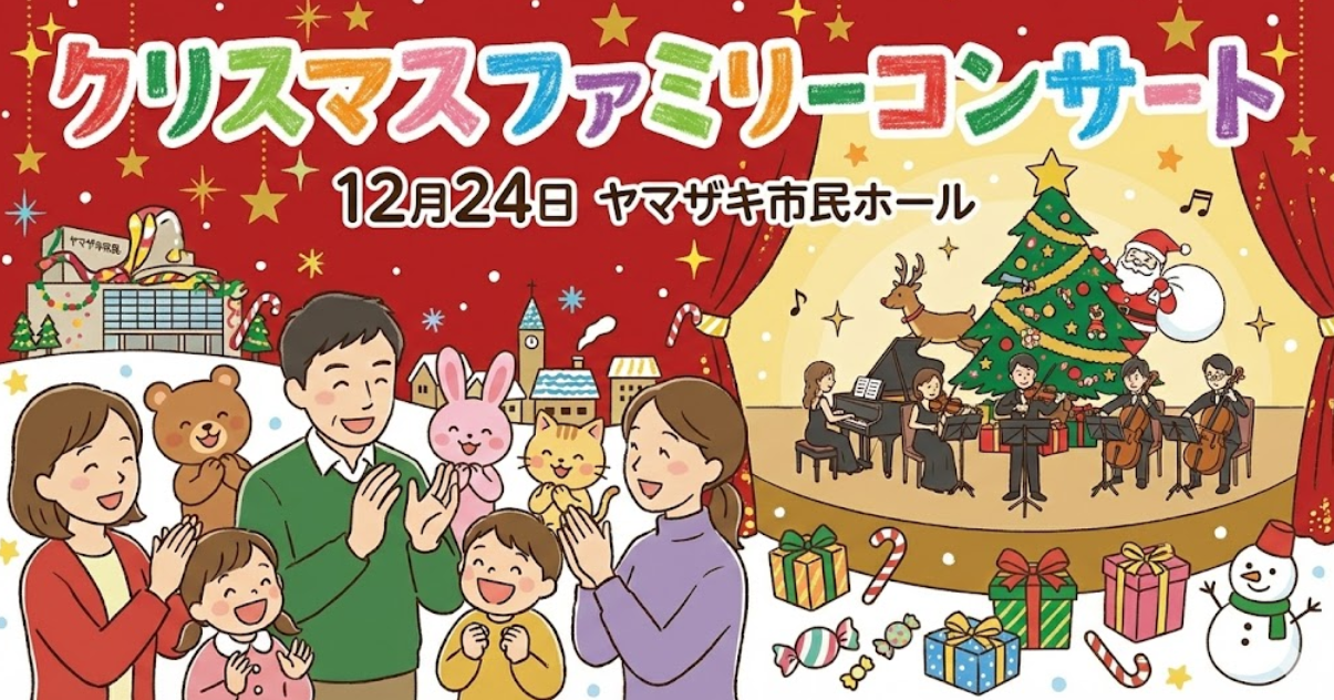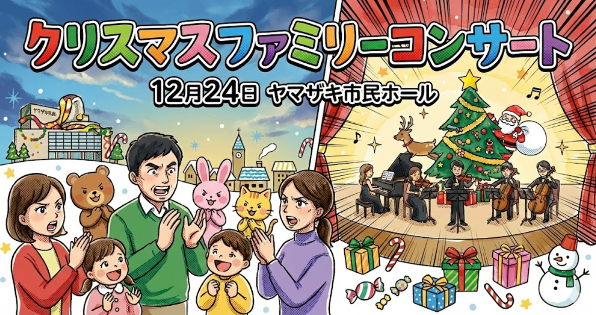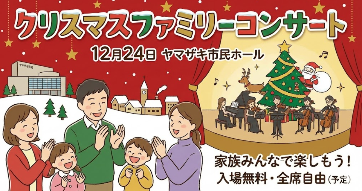 「12月24日、〇〇市民ホールでクリスマスコンサート開催。家族で楽しめる雰囲気のポスターを作って。タイトルは『クリスマスファミリーコンサート』」