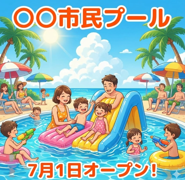 「〇〇市民プール、7月1日オープン! 家族で楽しめる夏のプールのイメージ。Instagram正方形サイズで」
