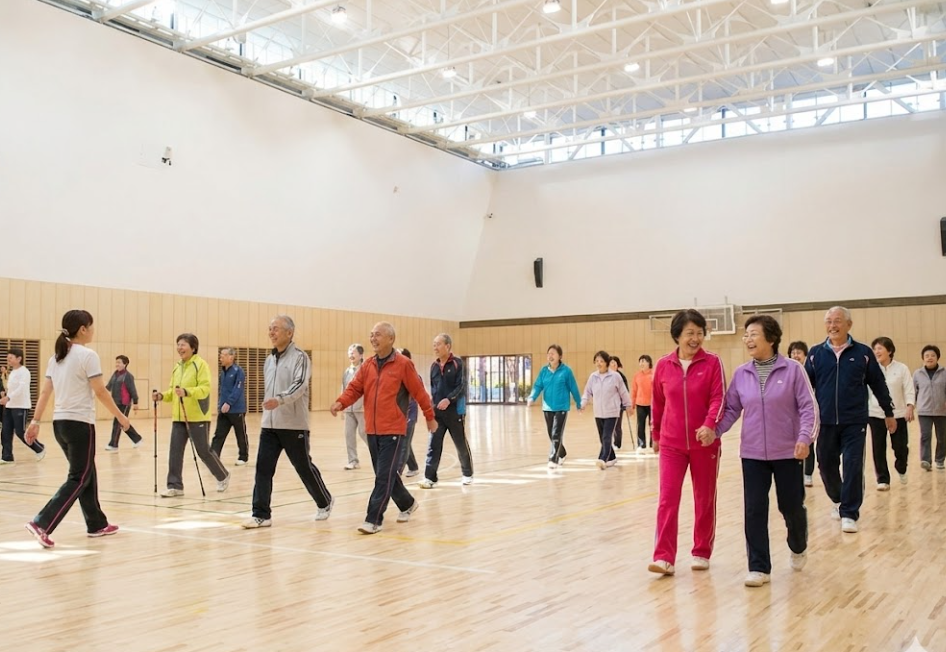 「添付した写真を背景に、高齢者の方々の転倒防止の歩き方教室を受講している様子。未来に向けた前向きで明るい気分ではつらつと取り組む様子」