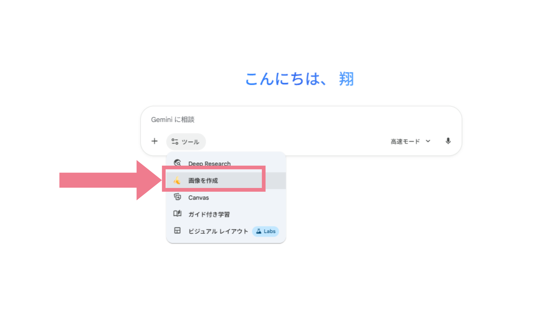 Googleの「Gemini」アプリを開き、ツールからバナナマークのある「画像を作成」をクリック!