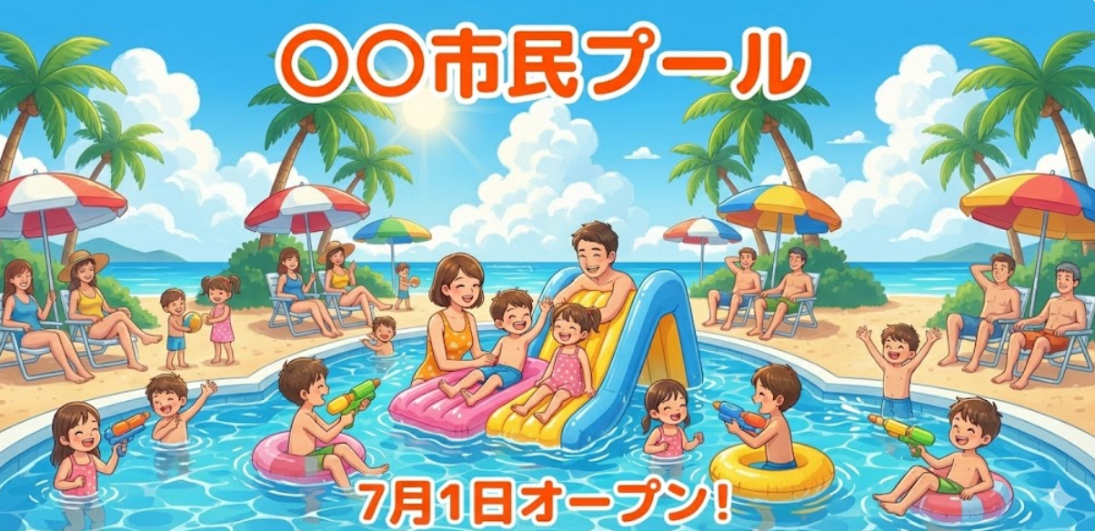 つまり、「〇〇市民プール 夏季営業開始!」というポスターが、AIだけで完成するんです。
