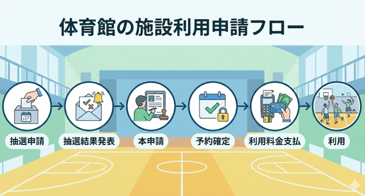 - 「施設の利用申請フロー」を、矢印とアイコンで可視化