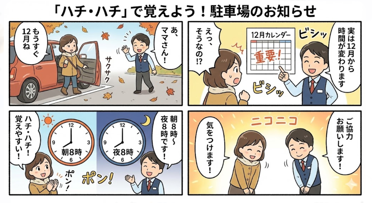 【お知らせ内容】 12月から駐車場の利用時間が変更になります。新しい時間は朝8時〜夜8時です。ご協力お願いします。