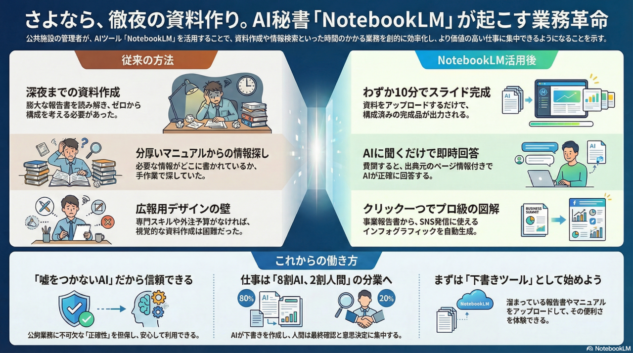 【NotebookLM革命】2025年11月、Googleの実験的AIツールが資料作成を一変。年度報告書やマニュアルから、議会報告用スライドやプロレベルの図解を全自動で生成します。ChatGPT/Geminiと異なり、アップロード資料内の情報のみを使用し、出典を明示する「嘘をつかない」信頼性が公的業務に最適。徹夜でのパワポ作成から解放され、「8割AI、2割人間」の分業体制へシフト。公共施設管理の現場で役立つAI活用術と、明日から始める第一歩を解説します。