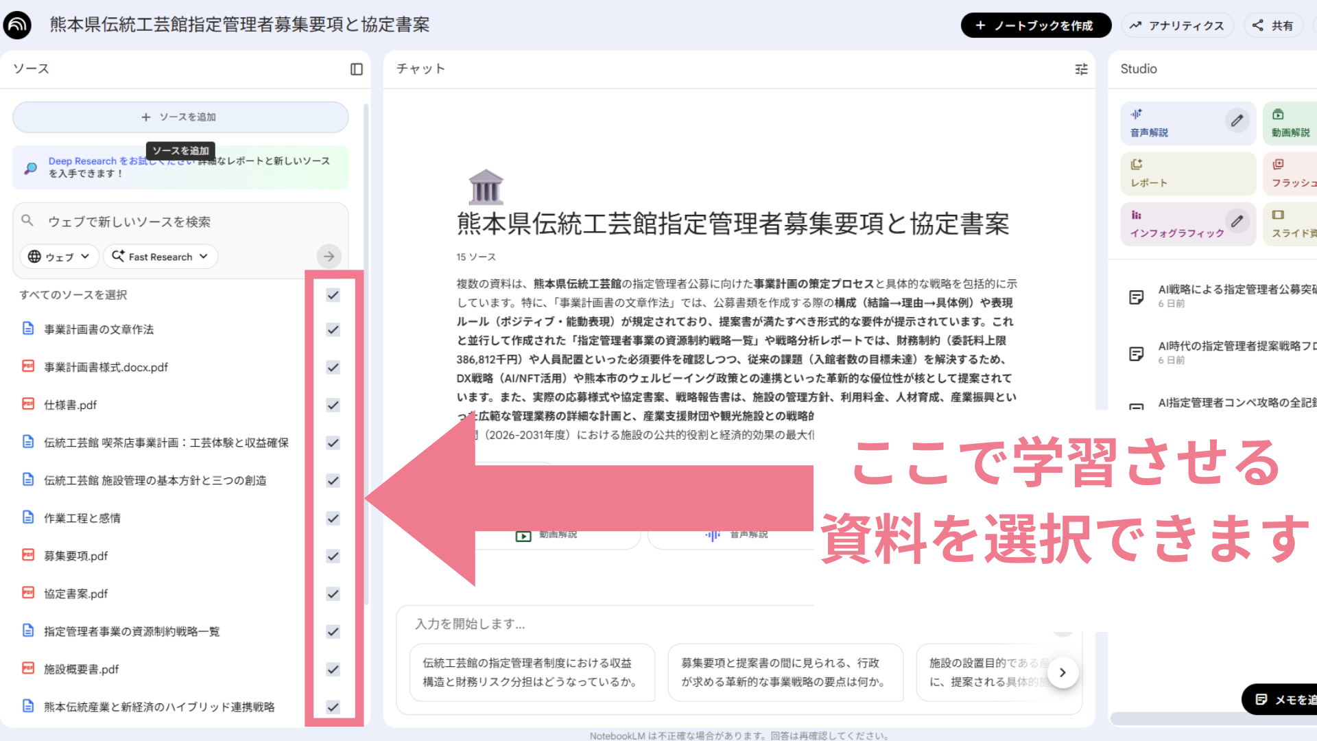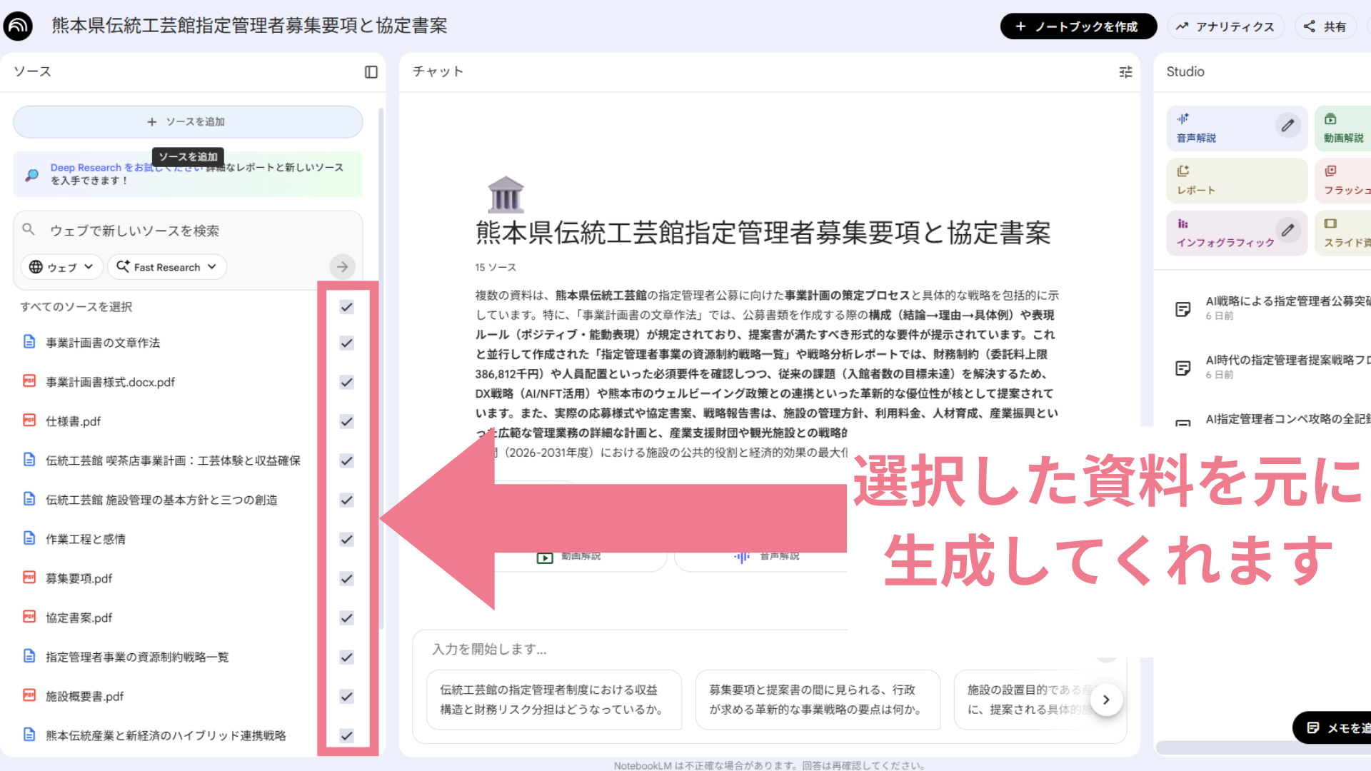 NotebookLMは渡された資料にない情報は「わかりません」と明言する。 条例や契約書など、嘘が許されない場面での事実確認に最適なんです。