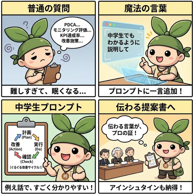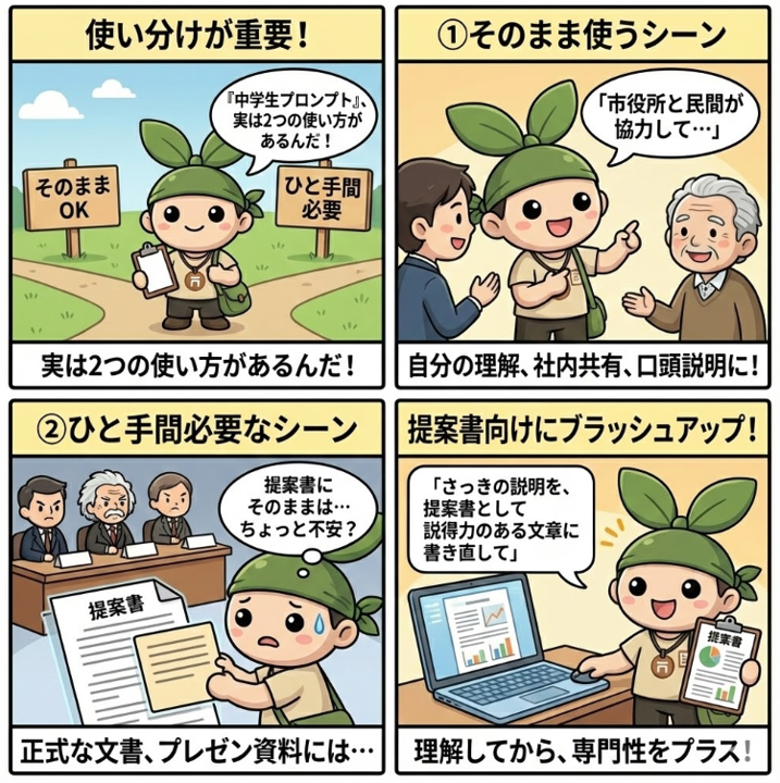 - 「中学生でもわかるように説明して」は、理解と口頭説明にはそのまま使え、提案書にはもう一段階ブラッシュアップが必要