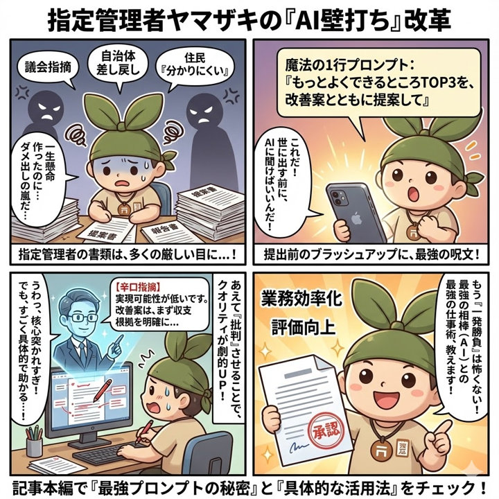 指定管理者必見!編集長ヤマザキが多用したプロンプト5選の第3弾。「もっとよくできるところTOP3を改善案とともに提案して」で、提案書や報告書を世に出す前にAIでブラッシュアップ。自治体や議会からの指摘を激減させ、業務効率を劇的に向上させる実践的テクニックを解説。辞書登録して今日から使えます。