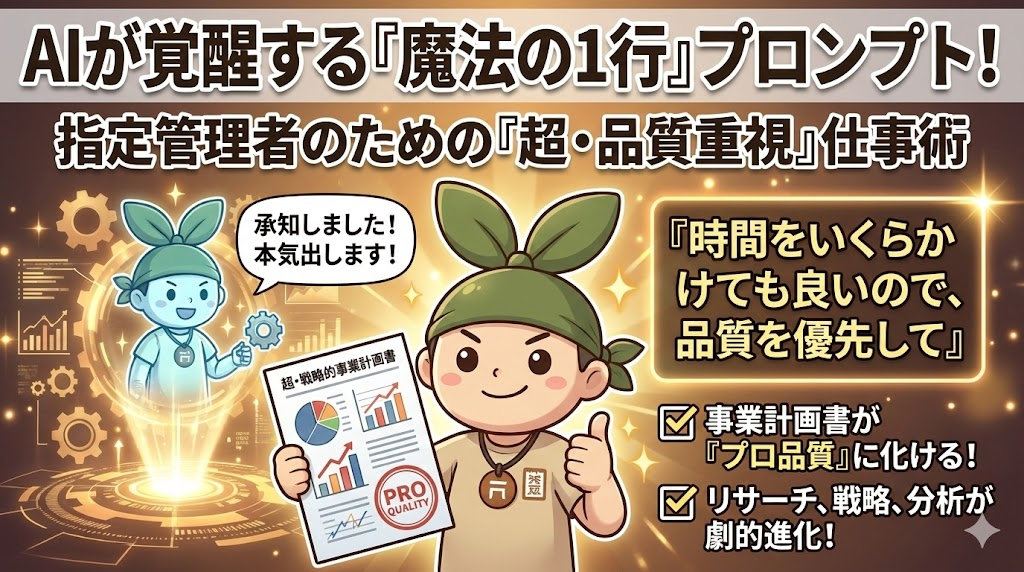 事業計画書をAIに作らせたら「なんか浅い…」と感じたことありませんか?実はAIが本気を出していないだけ。「時間をいくらかけても良いので、品質を優先して」というたった一言を加えるだけで、出力が"学生レベル"から"プロの仕事"に激変します。指定管理者の応募書類や重要なプレゼン資料で使える、編集長ヤマザキ多用プロンプト5選の最終回。