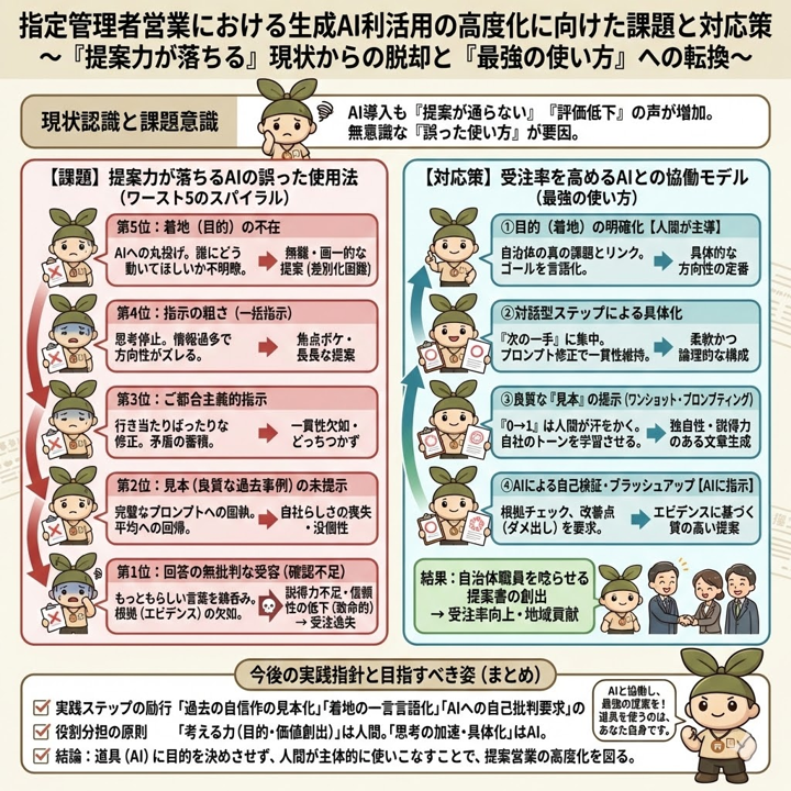 指定管理者の営業担当者がAIを使って提案書を作る際、無意識にやっている「提案力が落ちる使い方TOP5」を解説。着地を伝えない、細かく指示しない、いきあたりばったりな指示、見本を示さない、確認しない。これらを避け、AIと協働して受注率を上げる具体的な方法を指定管理制度AI編集長のヤマザキが伝授します。