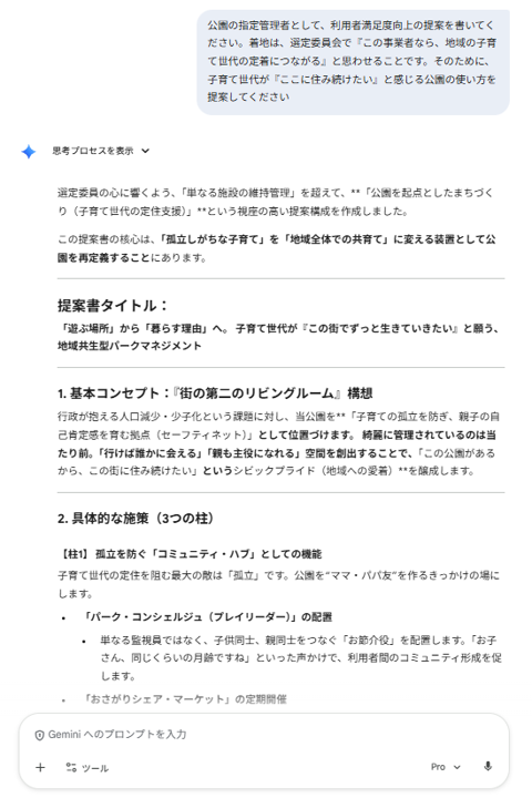 「公園の指定管理者として、利用者満足度向上の提案を書いてください。着地は、選定委員会で『この事業者なら、地域の子育て世代の定着につながる』と思わせることです。そのために、子育て世代が『ここに住み続けたい』と感じる公園の使い方を提案してください」