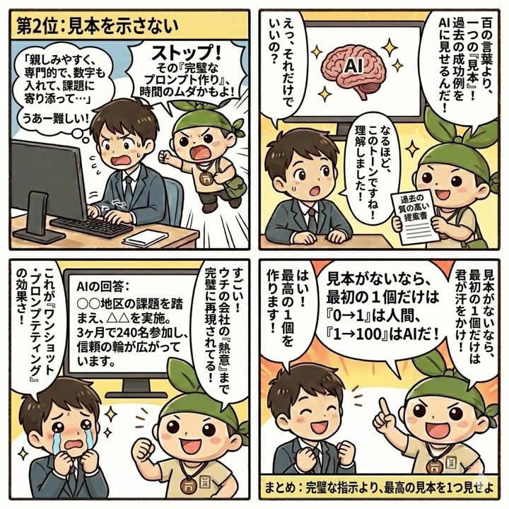 第2位:見本を示さない → 過去の優良提案から「最高の1個」を見せて、会社らしさを再現させる
