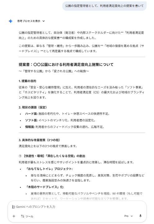 「公園の指定管理者として、利用者満足度向上の提案を書いて」