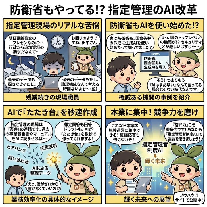 防衛省が国会答弁資料の作成に生成AIを導入しました。実は指定管理の現場も「答弁」の連続——行政ヒアリング、住民説明会、更新審査。AIを使えば想定問答集も回答ドラフトも爆速で作れます。指定管理者制度AIが、現場で使えるAI活用ノウハウを続々発信中!