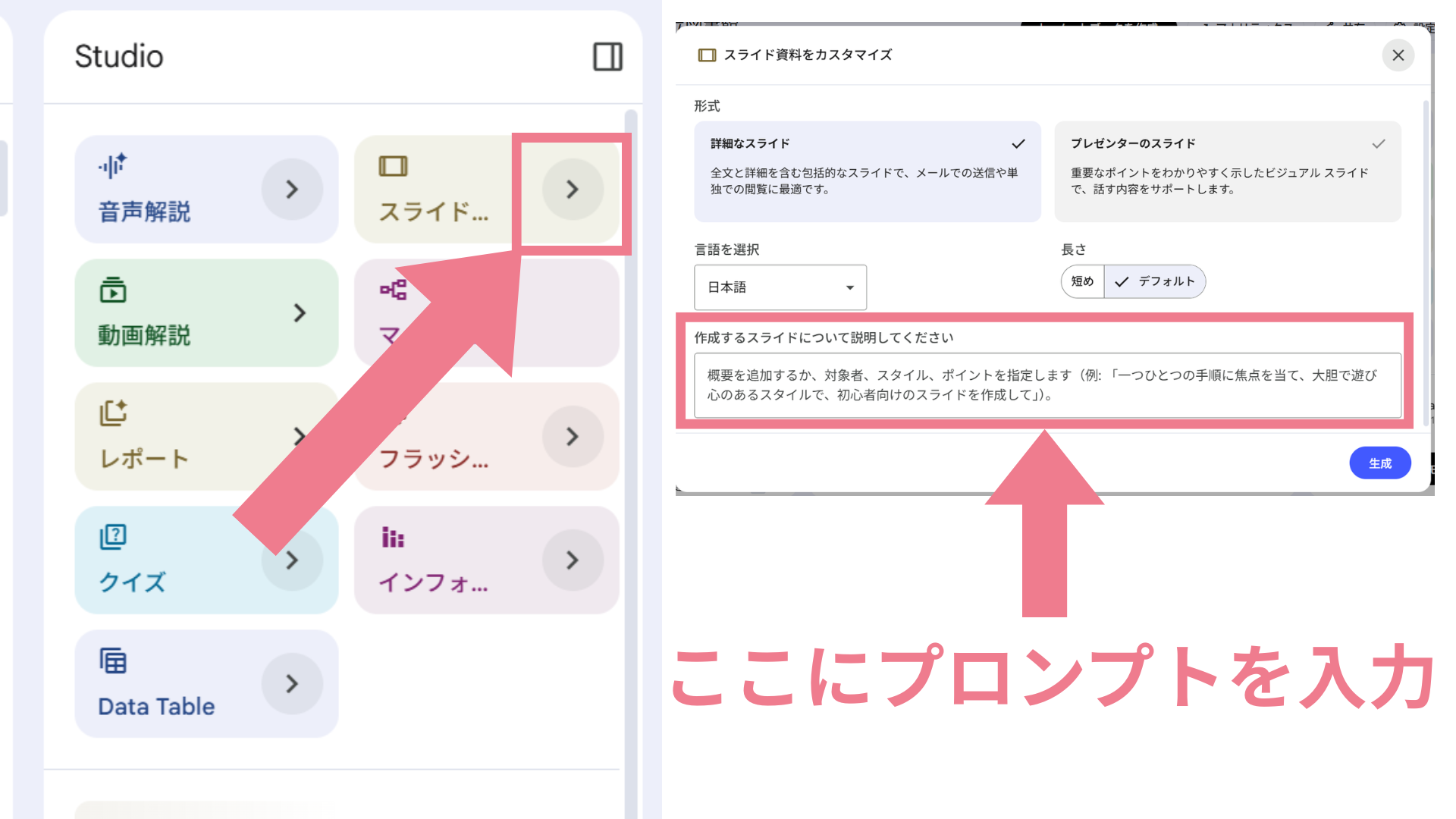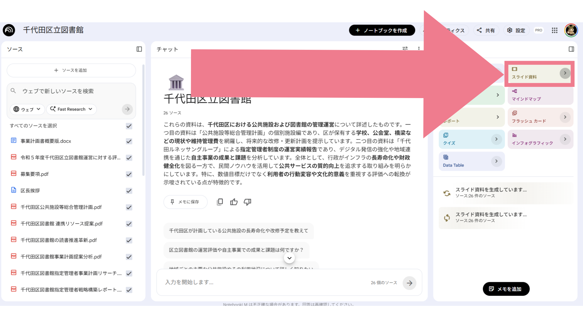 NotebookLMのスライド生成機能を使います。右上の「スライド」ボタンを押すだけで、投入したソースを元にプレゼン資料の骨子を自動生成。