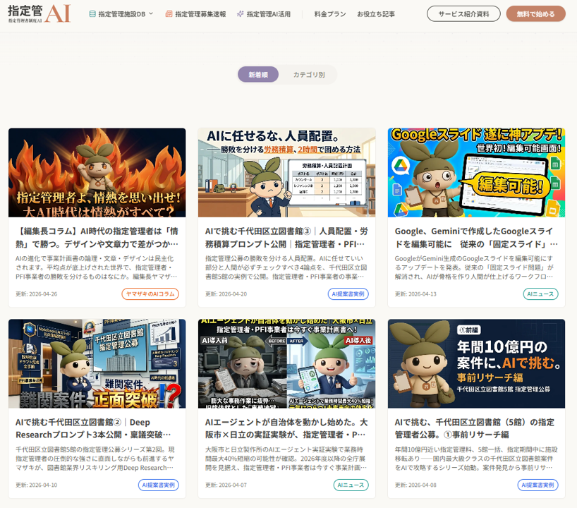 指定管理者・PFI事業者のみなさん、こんにちは。 指定管理者制度AI編集長のヤマザキです。